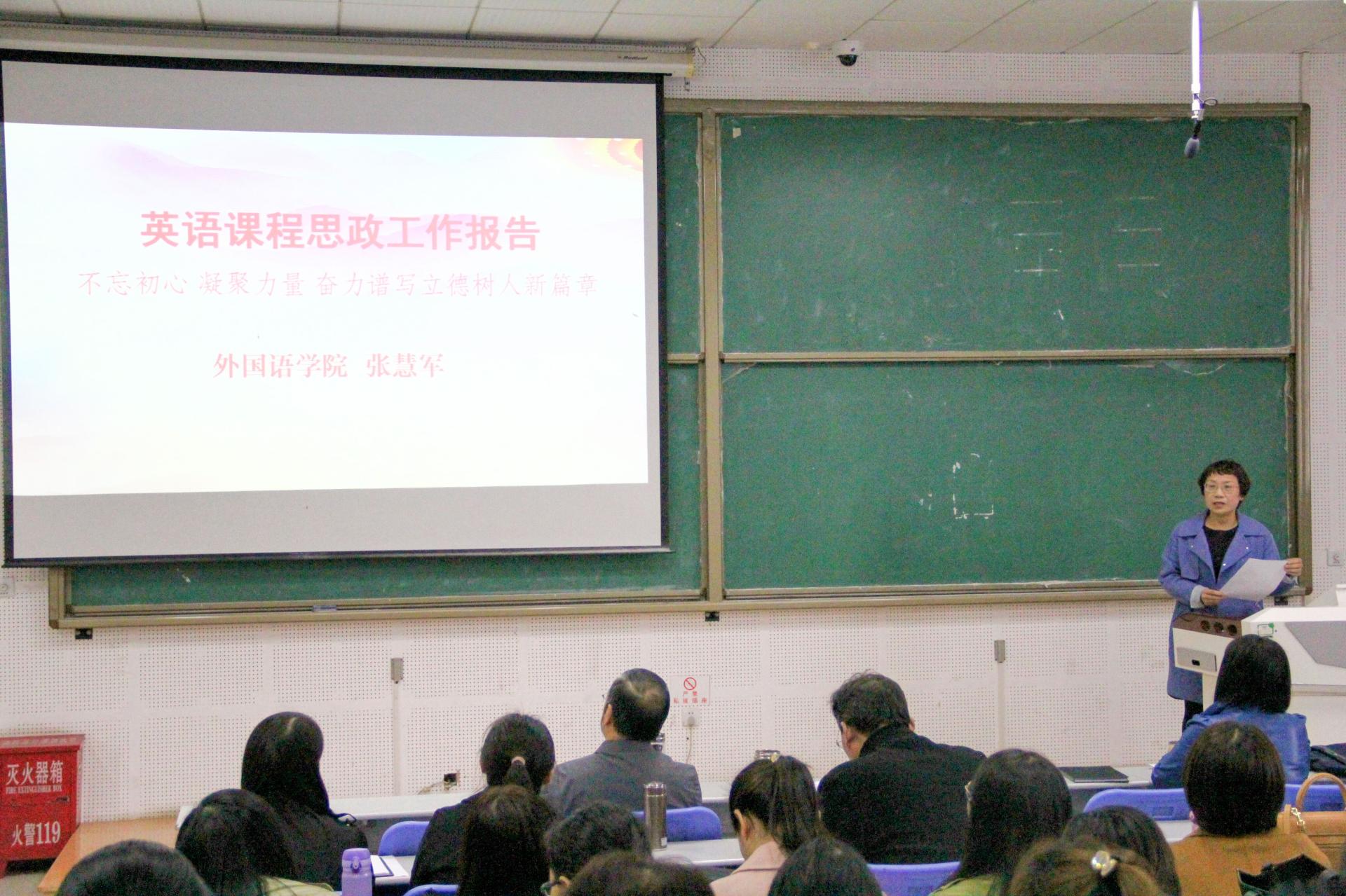 第四,外国语学院英语课程思政报告。院长张慧军以“不忘初心 凝聚力量 奋力谱写立德树人新篇章”为题做了英语课程思政工作报告。她以“三全育人+课程思政”的育人思路为切入点,从强化思想认识,提升思政理论水平;开展集体备课,践行课程思政理念;召开云端会议,促进课程思政经验的分享;组织参加学术会议,提高教师专业课程思政认识;召开科研团队会议,促进课程思政与教研结合;加强教材建设,丰富高校英语教材的“思政内容”;以活动为载体,实现专业学习与价值引领相融通;搭建锻炼平台,实现实践育人目标等八个方面对2019年以来外国语学院在课程思政工作方面的探索进行了总结。结合课程思政工作推进中存在的问题和经验交流会小组分享中教师提出的问题,她就加强课程思政的总体规划、深入挖掘课程蕴含的思政元素、促进课程思政理念的落地谈了学院今后的安排和进一步举措。