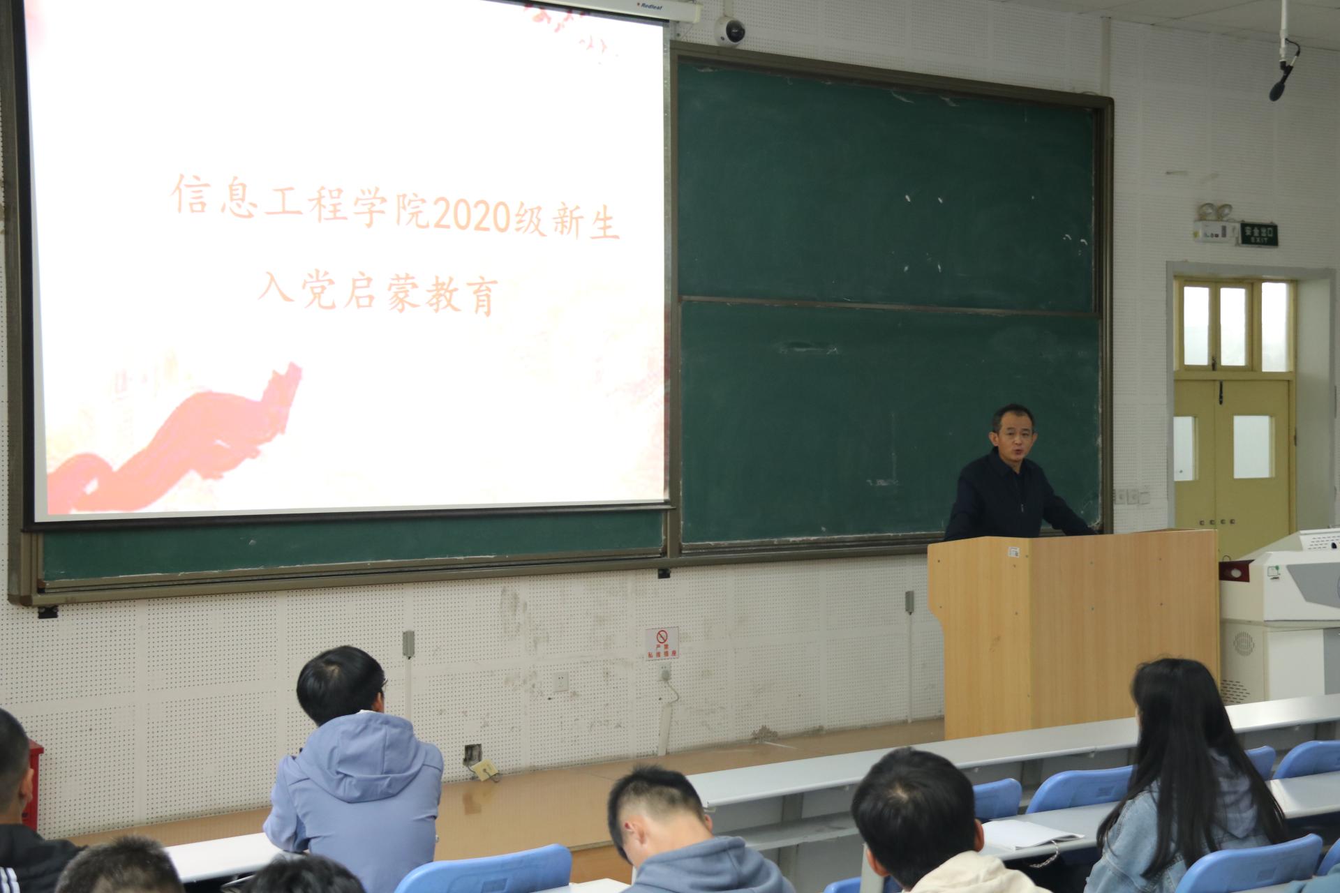 【信息工程学院】为了让新生更好地了解党的基本知识、伟大历程和神圣使命,帮助新生培养和形成正确思想观念,始终向党靠拢看齐,端正入党动机,2020年10月21日下午两点,信息工程学院在积学楼B1阶梯教室开展2020新生入党启蒙教育活动,信息工程学院副处级组织员高昆老师、辅导员李倩老师及2020级部分学生参加了本次活动。