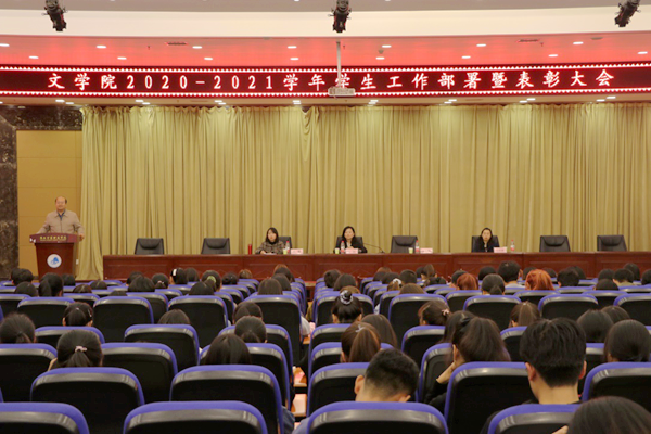 10月14日晚,文学院在学校图书馆报告厅隆重召开2020-2021学年学生工作部署暨表彰大会。学院党总支书记杨阳、院长牛文明、副院长马莉娜及全体辅导员、受表彰学生、全体学生干部共300余人参加大会。大会由学院党总支副书记庞曦主持。