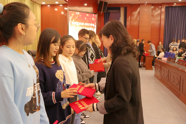 首先,庞曦副书记对上年度学生工作进行简要总结,宣读了学院关于2019-2020学年度优秀学生个人的表彰决定,对在上年度学生工作中表现优异的学生干部、获得师范生微课大赛、三笔字技能大赛、中华经典诵读大赛、互联网+大赛等各种竞赛奖励的学生个人和获得读书之星、创作之星、创新创业之星等荣誉称号的优秀个人以及在疫情期间积极参加疫情防控的优秀志愿者进行了表彰。在场的学院领导为受表彰的同学颁发了获奖证书并合影留念。