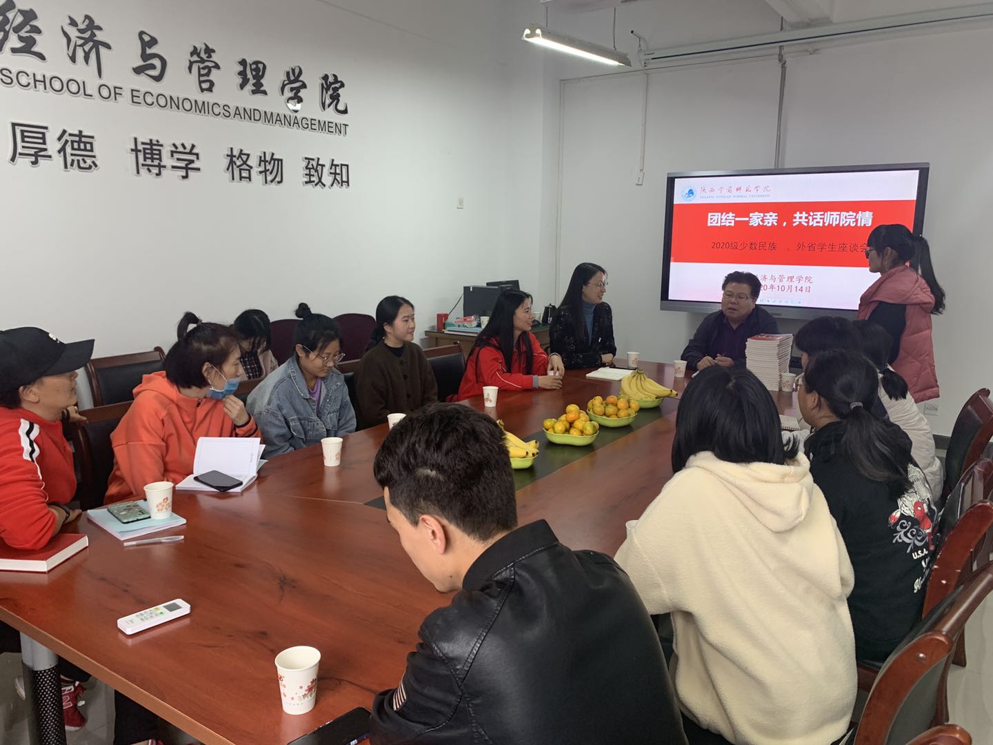 为传承民族团结优良传统,引导学生树牢中华民族共同体意识,并进一步加强与学生的沟通交流,按照学院民族团结进步月活动的相关安排,2020年10月14日下午两点半,经济与管理学院在一教楼B411会议室召开了以“团结一家亲,共话师院情”为主题的少数民族、外省学生座谈会。经济与管理学院党总支书记张建辉、党总支副书记陈璐、党委学工部刘霞老师、我院全体辅导员以及2020级少数民族、外省学生参加了本次座谈会。座谈会由学院党总支副书记陈璐主持。