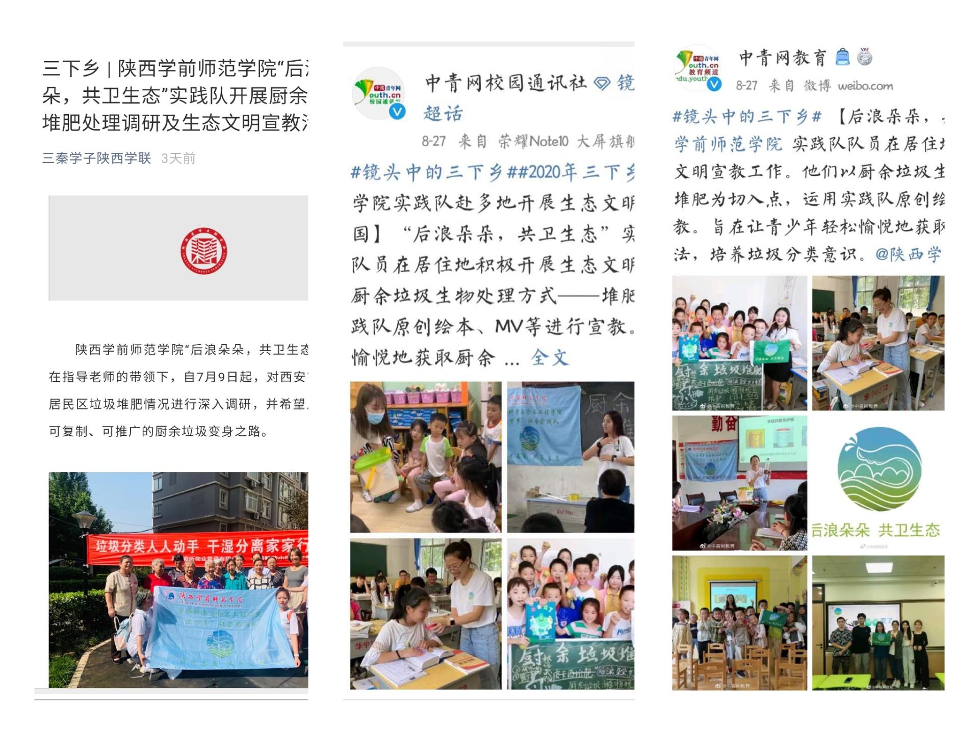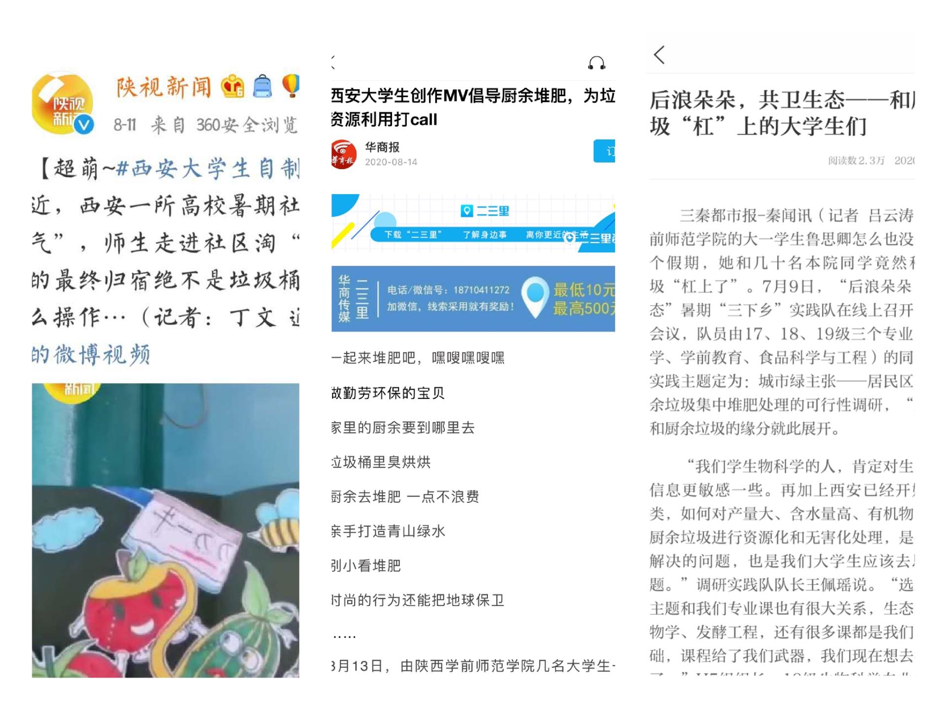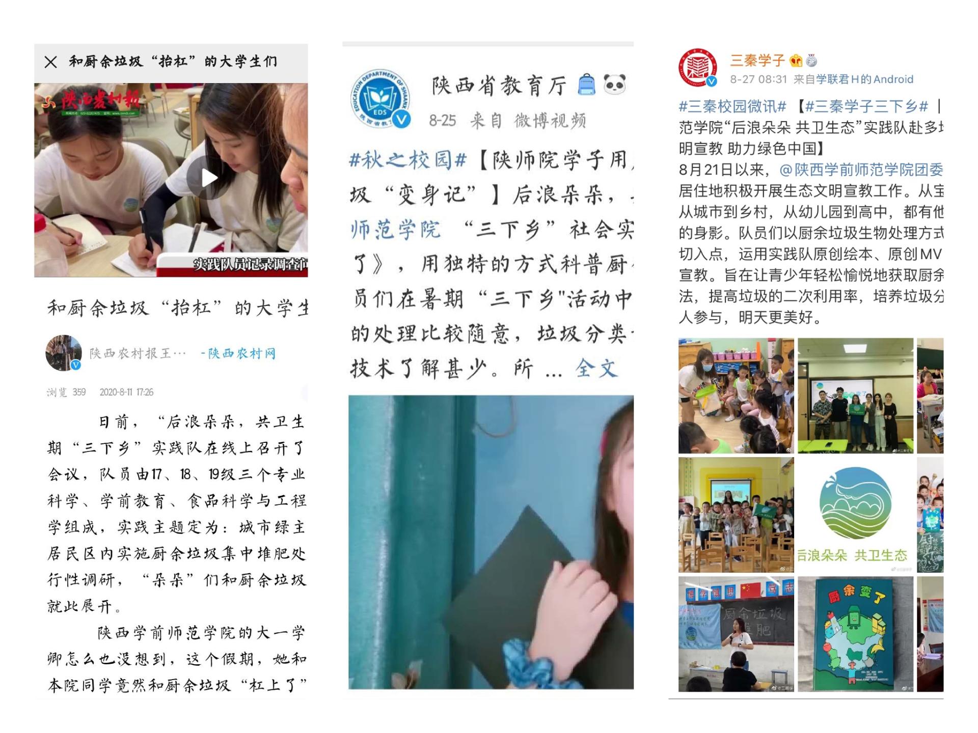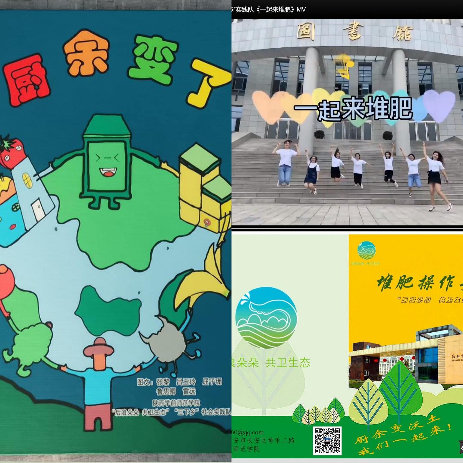 生命科学与食品工程学院“后浪朵朵 共卫生态”暑期“三下乡”社会实践队根据学校部署,结合疫情防控工作要求,在校团委、院系党政班子的指导下,精心设计、周密安排,遵循“就近就便”原则,采用线上线下联动的方式,开展了“居民区厨余垃圾集中堆肥处理的可行性”调研实践。在深入调研,掌握大量数据的基础上,指导老师带领实践队员发挥专业特色,制作出了丰富的生态文明宣教材料:原创绘本《厨余变了》、原创MV《一起来堆肥》、原创手册《堆肥操作手册》,并且灵活运用,在队员居住地开展了形式多样、丰富多彩的宣教活动,受到陕视新闻官微、陕西教育厅官微、中青网教育频道官微、中青网校园通讯社官微、三秦都市报、华商报、三秦学子官微、三秦学子陕西学联公众号、陕西农村网共计9家媒体宣传报道。
