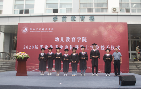 幼儿教育学院副院长张亚妮宣读了《关于准予魏沙、杨文秀等648名学生毕业的决定》、《关于授予魏沙等378名本科毕业生学士学位的决定》,与会领导为毕业生代表颁发毕业证书。2017级优秀毕业生张一心同学带领全体毕业生面向国旗庄严宣誓:用智慧和才华肩负起民族复兴的使命;用青春和热血承担起国家富强的责任。今天我以陕师院为骄傲,明天陕师院以我为自豪......毕业生代表送上的歌曲《梦想》祝福同学们乘风破浪,向更高的理想迈进。