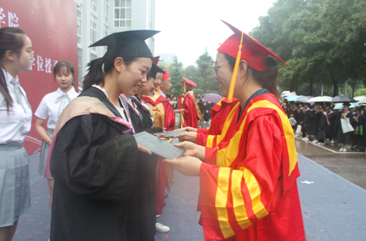 在庄严的学位授予仪式上,幼儿教育学院党政领导及各系主任一一为获得学士学位的毕业生颁发学位证书并扶正流苏。细雨中体现浓浓深情,378名本科毕业生向老师深深鞠躬,接过沉甸甸的学位证书,激动而兴奋。