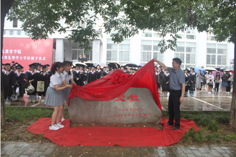 2016级本科毕业生武婷主持了毕业礼物互赠仪式。2020届全体毕业生为学院赠送镌刻着“乐幼爱教”的学院石,祝福母校桃李满天下,为幼教领域培养一批又一批的合格人才。学院给每位毕业生送了一枚小小印章作为毕业留念,礼物虽小,但情意绵长。校长邵必林亲临现场,为纪念石揭幕,并为毕业生代表赠送毕业礼物。