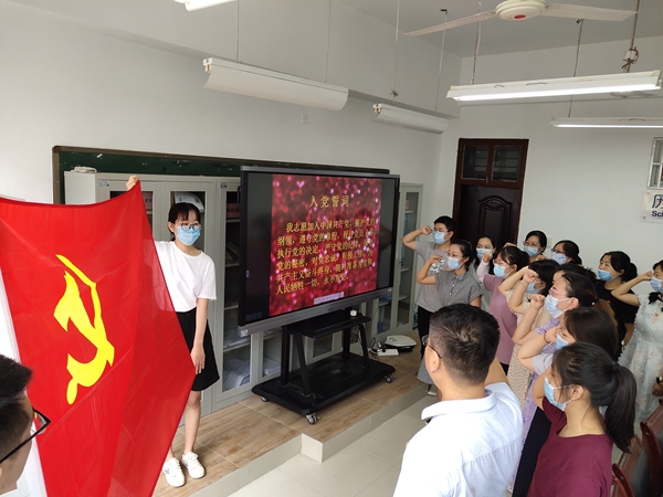 活动最后,在党总支书记童广运的带领下,全体党员师生举起右拳,进行庄严宣誓,共同重温入党誓词,深化了党员对共产党初心的认知,更加深刻理解了共产党人的使命担当。活动在师生激昂的歌声中圆满结束。