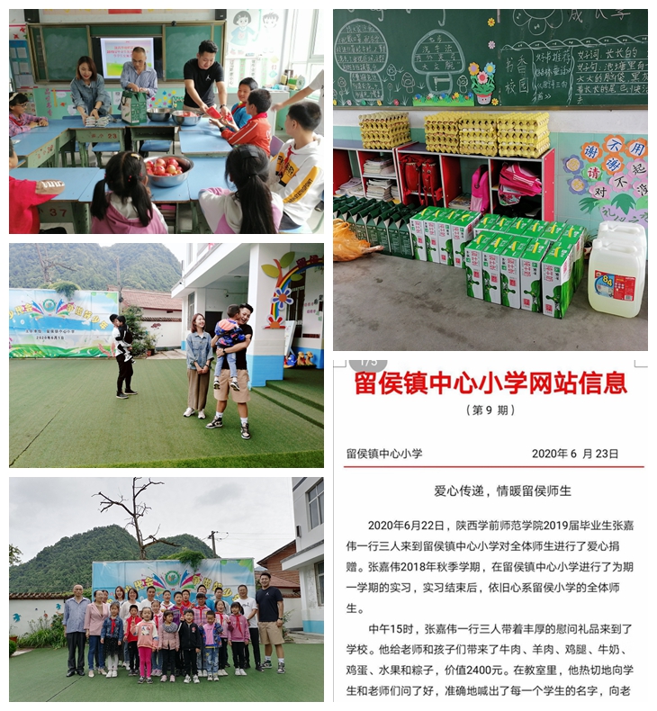 2020年6月22日,体育学院2019届毕业生张嘉伟到留侯镇中心小学对全体师生进行了爱心捐赠。2018年秋季学期,张嘉伟在留侯镇中心小学进行了为期一学期的实习,实习结束后,依旧心系留侯小学的全体师生。作为一名党员,他用实际行动践行初心和使命,助力学校扶贫工作;作为曾经的实习老师,他把关爱送到孩子们的心中,让爱洒满校园,让爱心传递,弘扬了人间正能量。