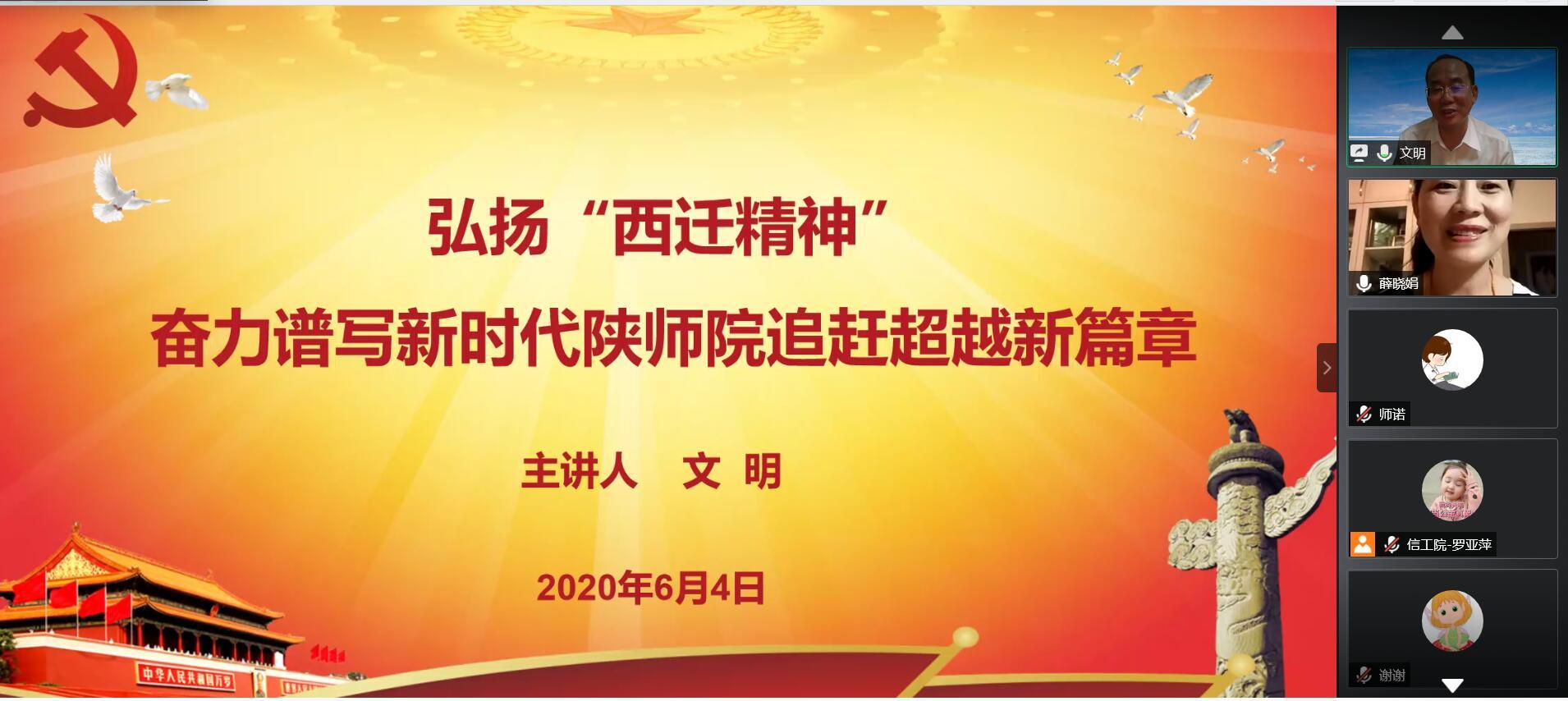 为深入学习贯彻习近平总书记来陕考察重要讲话精神,在学懂弄通做实精神实质、核心要义上持续下功夫,弘扬“西迁精神”,不断提高党组织战斗力,更好发挥党员先锋模范作用,促进学校事业持续发展。6月4日晚19:30,文明副校长给所联系院系和分管部门的师生党员讲授题为“《弘扬‘西迁精神’,奋力谱写新时代陕师院追赶超越新篇章》”的专题党课。信息工程学院、外国语学院、科研处、国际交流与合作处、学报编辑部、科教产业公司等文副校长所联系的2个院系和所分管的4家单位的全体师生党员及非党员师生近200人上线听课。本次党课由信息工程学院党总支书记薛晓娟主持。