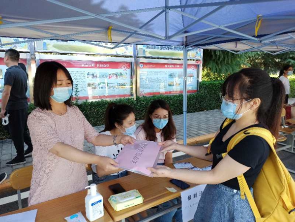 返校当日,全体辅导员早早守候在校园南门,等待同学们的归来。按照返校流程,返校学生在经过扫码确认、行李消杀、体温检测等一系列程序后,终于踏入了久违的校园。在文学院迎接点上,返校同学受到辅导员老师的热情接待,顺利完成了进校登记和返校确认,上交了健康承诺书,领取了入住公寓卡和爱心包,使同学们深切感受到“回家”的温暖,小小“爱心包”也传递了学院对同学们的深切思念。