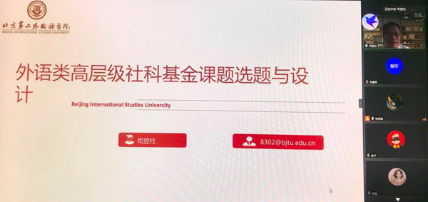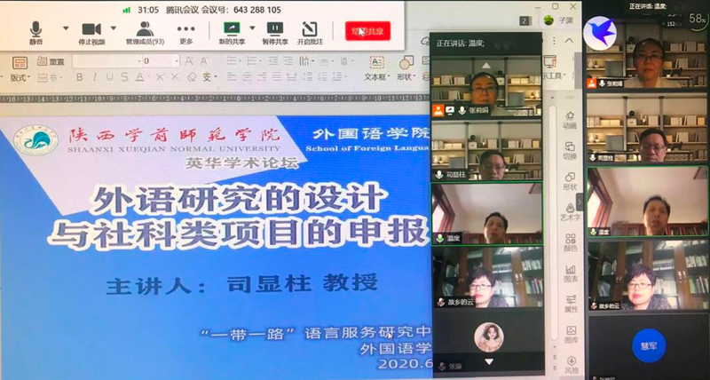6月3日下午2:30-4:30,外国语学院邀请北京第二外国语学院“翔宇领军学者”,博士生导师司显柱教授做客“英华学术论坛”网络直播间,为学院师生做题为“外语研究的设计与社科类项目的申报”学术讲座。此次会议由外国语学院副院长张莉娟副教授主持,外国语学院党总支书记张慧军教授、“一带一路语言服务中心”负责人温宏社教授、外国语学院全体教师及2017级英语本科、2019级专升本班学生,以及来自西安外国语大学、陕西科技大学、西安理工大学等高校的教师与研究生共140余位人员在线聆听了司教授的讲座。