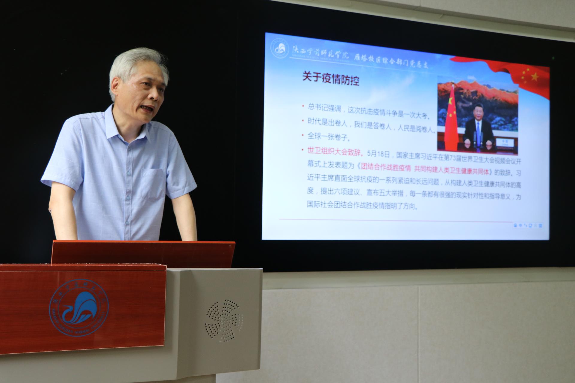 王奂新在讲课中传达了校党委《关于学习宣传贯彻习近平总书记来陕考察重要讲话精神的通知》(陕师院党〔2020〕10 号),紧紧围绕习近平总书记对陕西发展提出的总体目标和五项要求,对照总书记2015年对陕西工作提出的“五个扎实”要求,结合学校和党总支工作实际,谈了个人的学习感想与体会。
