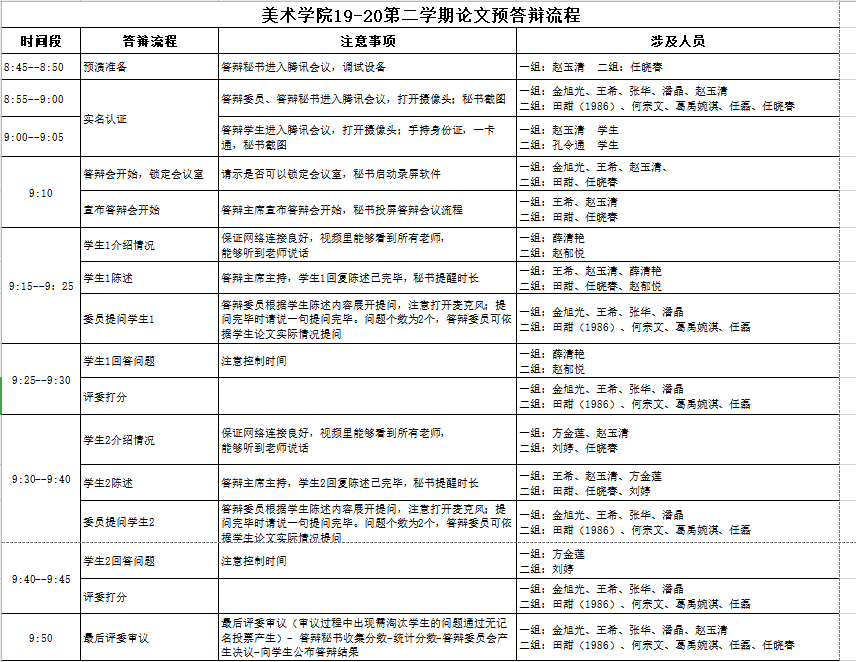 按照美术学院线上答辩工作预案,与往常规答辩流程相比,线上答辩主要在开场实名认证、线上讨论保密、线上投票确认部分存在较大工作区别,此四部分也是此次预演会的演练重点。