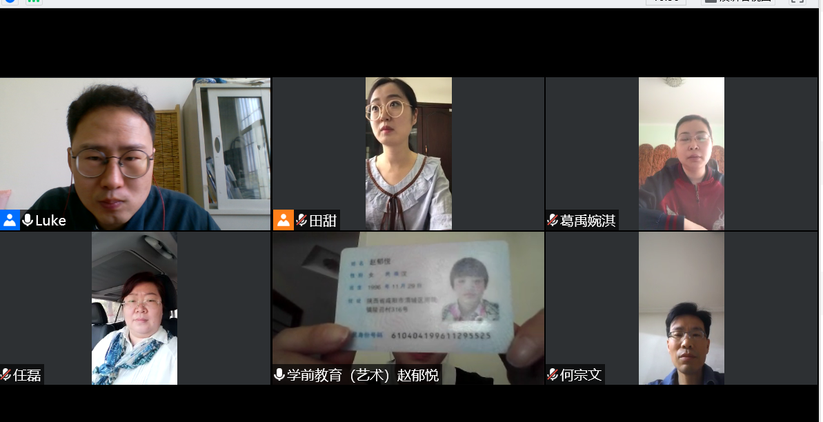 开场之前实名认证。由于网络环境公开度较高,为确认参加答辩会学生身份,开场之前答辩秘书需主持进行实名认证环节。参会学生开启摄像头同时手持身份证件,进行“人-证”匹配核对,答辩秘书截图留存。