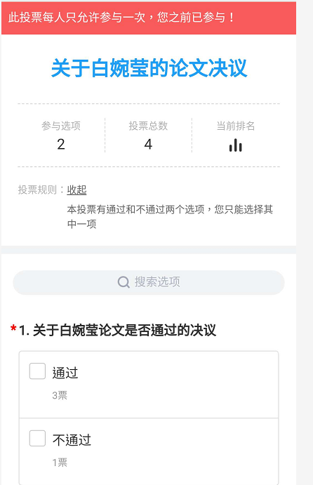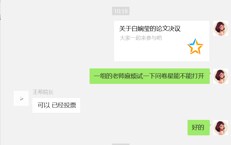 答辩委员讨论完毕后,答辩秘书通过会议室“聊天”窗口发送问卷星投票链接,投票完成后,各位答辩委员需回复“已投票”。投票结果后台统计后,答辩秘书通过“屏幕分享”功能展示投票结果,各位答辩委员需回复“投票结果已确认”。答辩秘书需对回复确认环节截图留存。
