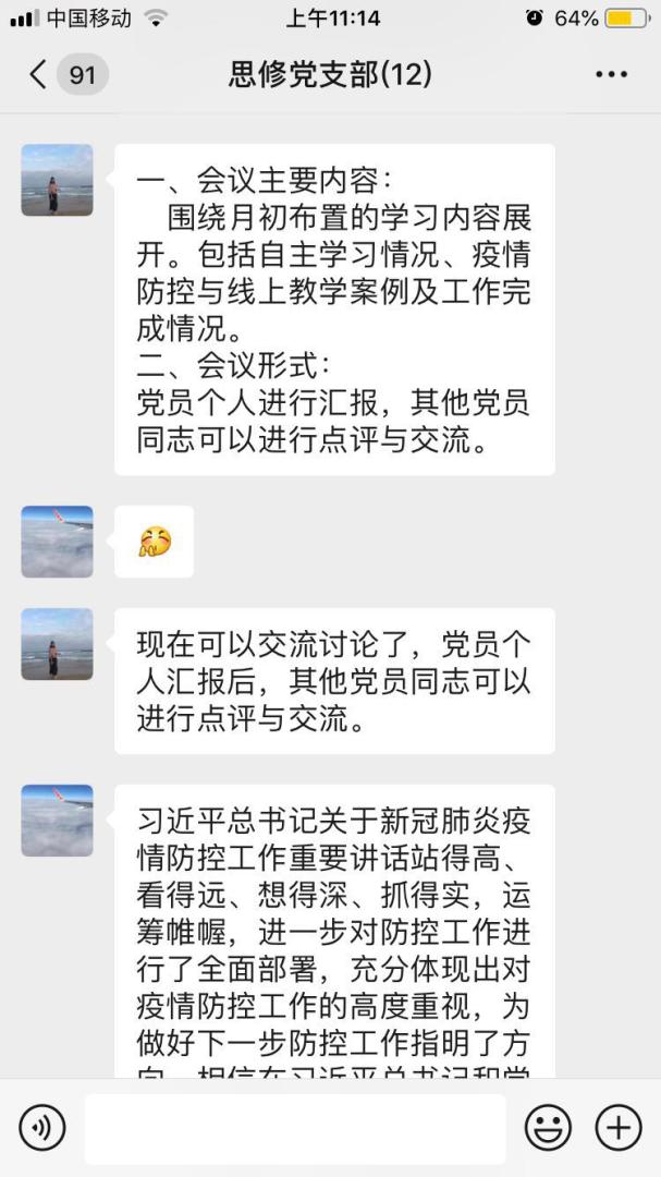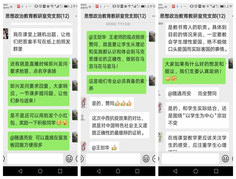 4月29日,思想道德修养与法律基层党支部开展线上主题党日活动。结合月初布置的学习内容展开,围绕自主学习情况、疫情防控与线上教学案例及工作完成情况,支部11名同志在支部微信群进行汇报与交流。党支部的同志分享了将疫情防控融入爱国主义教育、集体主义教育和理想信念教育的教学案例。大家普遍认为利用微信群、QQ群等与学生线下互动答疑,是补充线上课程的必要手段,思政课教师要进一步加强思想认识,提高政治站位,克服线上教学难点,凝练线上教学经验,充分利用线上教学资源,不断提升网络教学质量。