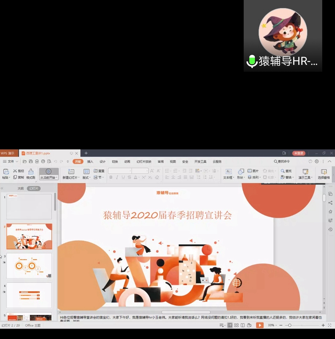 根据我院2020届毕业生当前就业实际情况,为了加速推进就业工作进展,2020年4月29日下午,猿辅导西安教育机构HR周美妮老师受邀,为我院毕业生做了网上专场就业招聘宣讲会。毕业班辅导员及2020届未就业本科毕业生参加了此次会议,会议由辅导员黄秀玲老师主持。