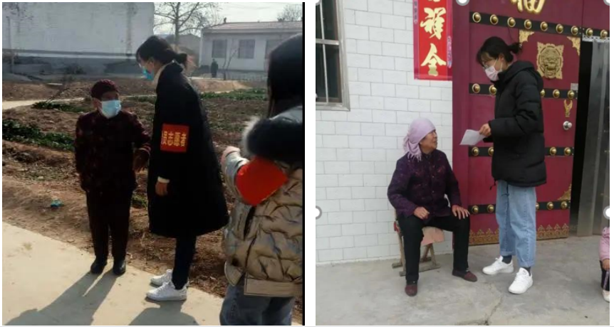 2016级汉本二班陶梦娟的家乡在渭南市蒲城县陈庄镇东鲁村,她积极响应当地政府号召,参与防疫,根据村委会和公安局的安排,明确工作区域,监督并检查每一户村民健康信息情况的录入,并协助当地村干部每天到村里的大广场和小广场规劝群众,不要让扎堆闲聊。陶梦娟说刚开始工作是有点困难,村里年纪大的人不了解疫情,也不清楚它的严重性,通过耐心仔细的讲解之后,他们逐渐重视起来,广场上变得安静起来,小巷中也没有走路串门的人,这使得她觉得很欣慰,也很有成就感。“红袖章”虽然只是一个标记,但是它是信仰,是荣誉。陶梦娟说:我们要向医务人员看齐,尽管不能替他们上“战场”,但是能尽一己之力,不为他们添麻烦,为国家尽微薄之力,保障后方的稳定,我们都在期盼灿烂如花的明日!