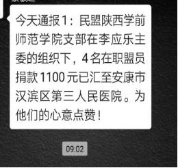 疫情当前,使命在肩。为积极响应习近平总书记和党中央、国务院关于坚决打赢新型冠状病毒肺炎疫情防控阻击战的重大决策部署,全面贯彻落实民盟中央和盟省委的相关工作安排要求,在学院党委和统战部的支持下,2月11日民盟荣耀体育最新官方支部向全体盟员发出捐赠倡议。盟员们积极响应,踊跃捐款,奉献爱心助力疫情防控,4位盟员(李应乐、党利龙、赵录旺、李怡璨)共捐款1100元。