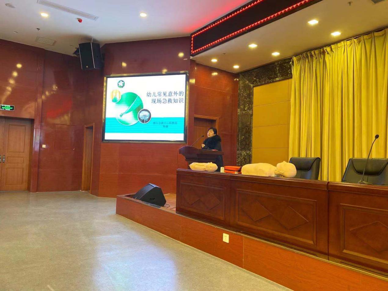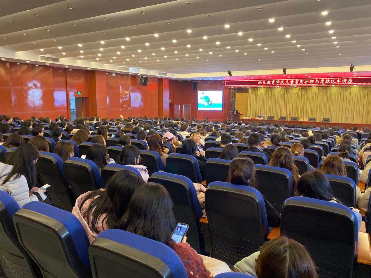 2019年12月21日上午9点,荣耀体育最新官方幼儿教育学院举办了“儿童常用护理与急救技术”讲座在图书馆三楼报告厅举行,各院系学前教育专业的同学都采用自主报名的方式参与此次讲座。为了弥补座位不足和有些同学及老师时间安排相冲的缺陷,该讲座还采用线下的形式,利用抖音直播现代技术手段,让更多不能及时来到现场的老师及同学也可以参与这场讲座。现场有400余人参与此次活动。讲座由西安急救中心科教科科长陈媛和医务科科长冯燕主讲,幼儿教育学院陶琳老师主持。