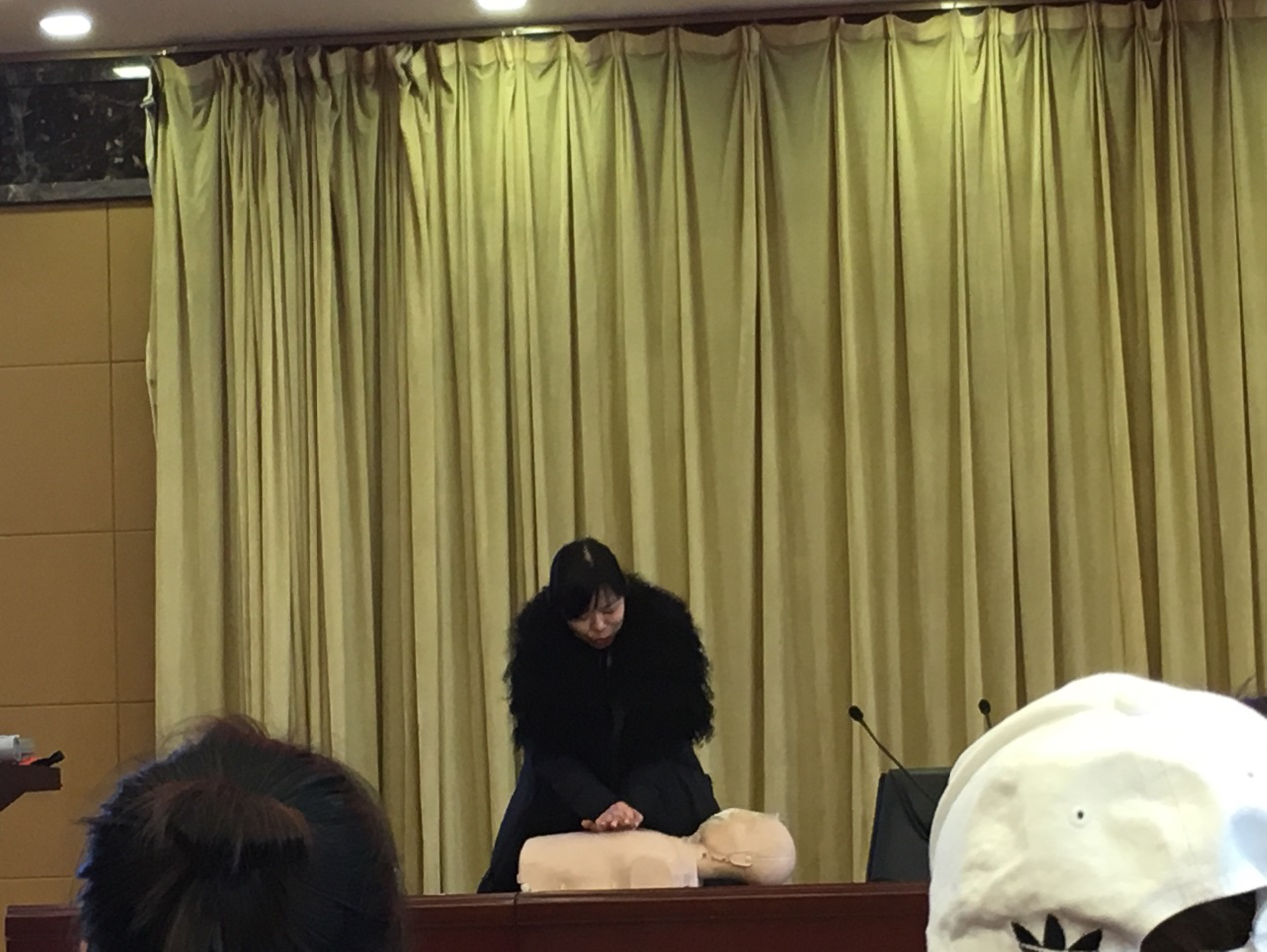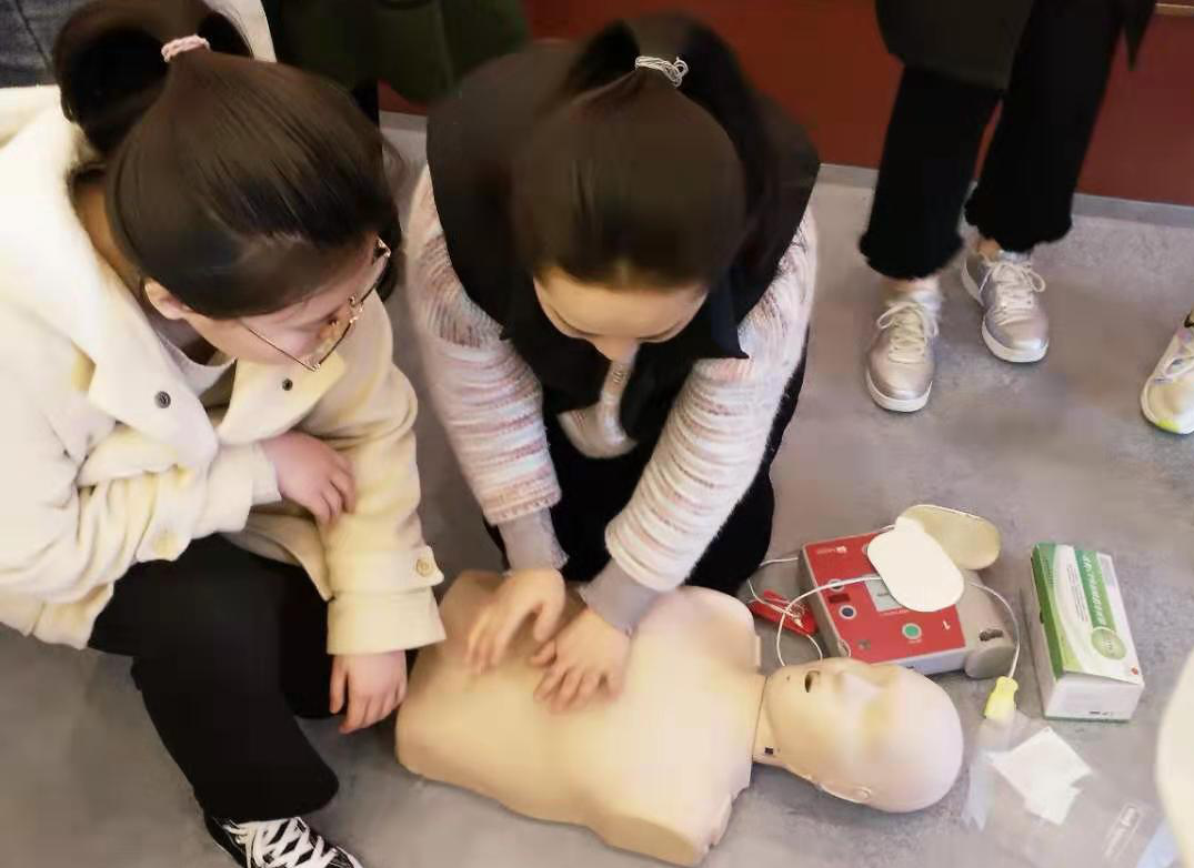 陈媛科长用风趣幽默的方式为同学们普及急救知识,同时也带来了最接地气的几种意外情况的科学急救技能:止血的方法有哪些?创伤现场急救的“四大技术”是什么?小儿高热惊厥怎么办?幼儿鼻出血的预防和处理方法是什么?烧烫伤应该如何处理?气道梗阻怎么办?遇到中暑我们应该如何处理?如何正确地心肺复苏等等。每一种科学急救知识都颠覆了同学们过去所谓的“常识”,每一种正确施救的姿势都吸引同学们在现场自发练习和模仿。短短的两个多小时干货满满,同学们收获的不仅是知识,还有对生命之重的认识。讲座最后陈媛科长邀请同学亲身体验心肺复苏的整个过程,进行一对一指导,确保同学们步骤正确,手法正确。