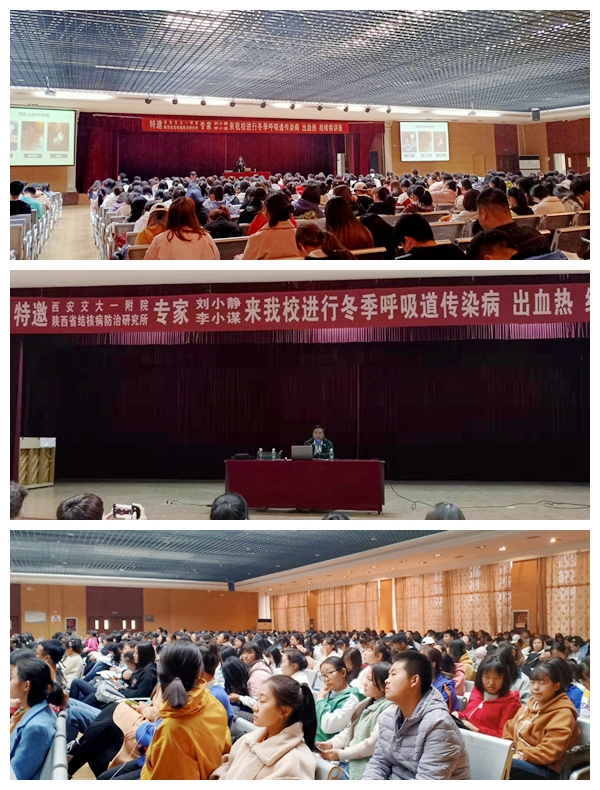 西安交大一附院感染科刘小静副主任医师进行了肾综合征出血热、流感、水痘、流行性腮腺炎等呼吸道传染病相关知识授课,以图文并茂的形式生动形象地从以上每种疾病的概述、临床症状、传播途径、治疗方法、预防措施进行了讲解。告诉同学们有关出血热的四句口诀“高热脸红酒醉貌,头痛腰痛像感冒,皮肤黏膜出血点,恶心呕吐蛋白尿”,并强调疫苗接种是防控出血热的最有效措施。指出预防以上疾病的关键是养成良好的卫生习惯,出现发热、头痛、皮疹等症状,及时就医。强调传染病不可怕、科学防护有办法、一旦不适及时就医、预防保健做到日常。现场和同学互动,提问式授课,使同学们在轻松活跃的气氛中了解了出血热及冬季传染病的预防知识。