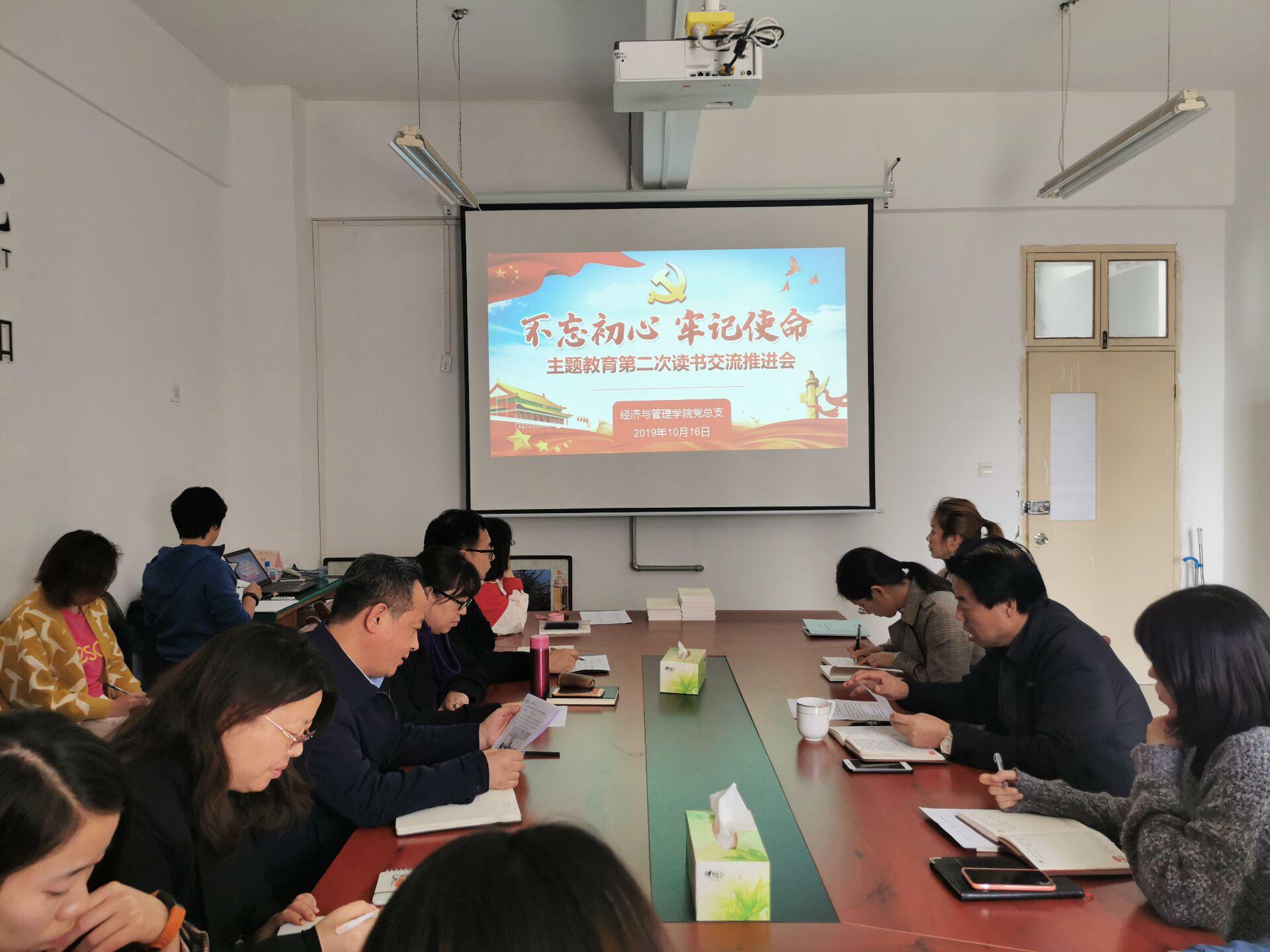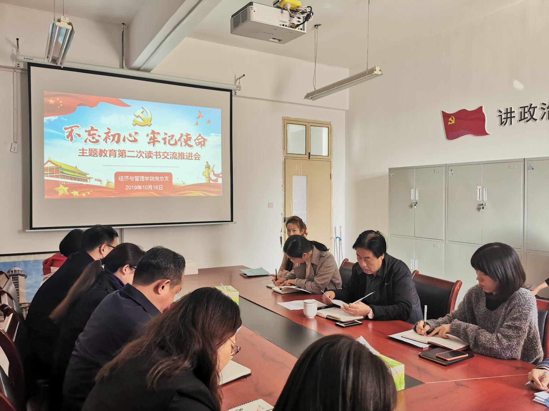 2019年10月16日下午,经济与管理学院在1教楼B411会议室召开“不忘初心、牢记使命”主题教育第二次读书学习推进会,院党总支书记主持会议,院全体教师党员参加会议。