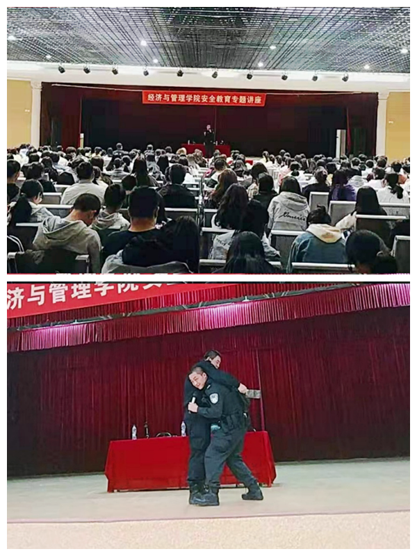 杨队长用通俗易懂的语言和鲜活的案例指出了提升自我安全防范意识的重要性。他就处置突发性事件的方法进行了指导,教导学生辨别危险源、保护自身安全,同时,杨队长重点为大家演练了女子逃生术。最后杨队长还对警队配备的防暴钢叉、警棍、盾牌使用情况进行了详细的讲解并让学生们上台模拟使用。