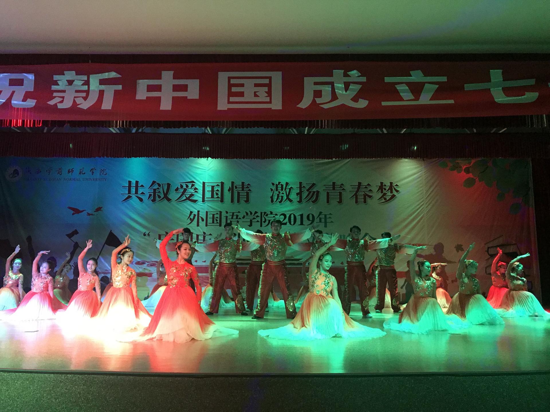 此次“共叙爱国情·激扬青春梦”文艺晚会是外国语学院“不忘初心,牢记使命”系列主题教育活动之一,国庆期间学院党总支还要开展主题党日活动,组织全体党员观看庆祝中华人民共和国成立七十周年大会、“我和我的祖国”观影以及线上讨论活动,激发广大教职员工爱国情、奋斗志,凝心聚力,攻坚克难,坚决做好预评估的整改工作,助力学校打赢合格评估攻坚战。
