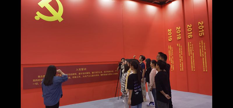 最后,美术学院学生党员们还自发在展览中的党徽下集体重温入党誓词,又一次进行了庄严的宣誓。此次主题党日活动,更进一步激发了美术学院师生党员们的爱国主义情怀。增强了不忘初心、牢记使命,为祖国为人民不断奋斗的使命感,增加了美术学院党组织的凝聚力。