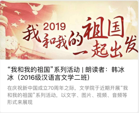 时光荏苒,岁月如歌。文学院团总支从学期初就组织开展了“我和我的祖国”和“为你读诗”系列诵读活动,以文字、图片、视频、音频等形式来展现大家经历的、知道的、记忆的、感动的精彩中国故事,用饱含深情的诵读,激励广大师生的爱国情怀,铭记新中国成立70周年的沧桑巨变,抒发了对党和国家的热爱和对实现中华民族伟大复兴中国梦的坚定信心。