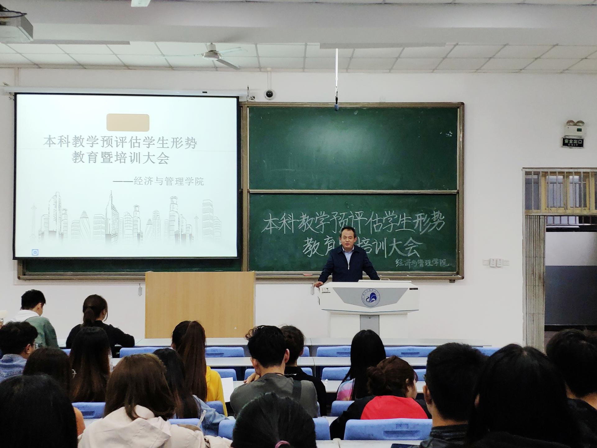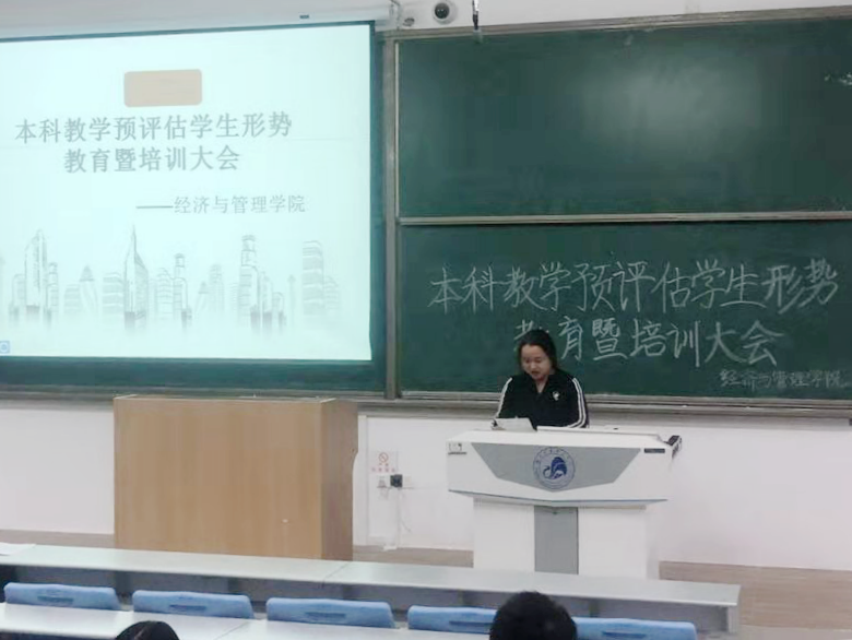 9月18日下午,经济与管理学院在一号教学楼B1阶梯教室举行本科教学预评估学生形势教育培训大会。学院党总支副书记主持并发表主题讲话,学生会干部及各班班委参加会议。