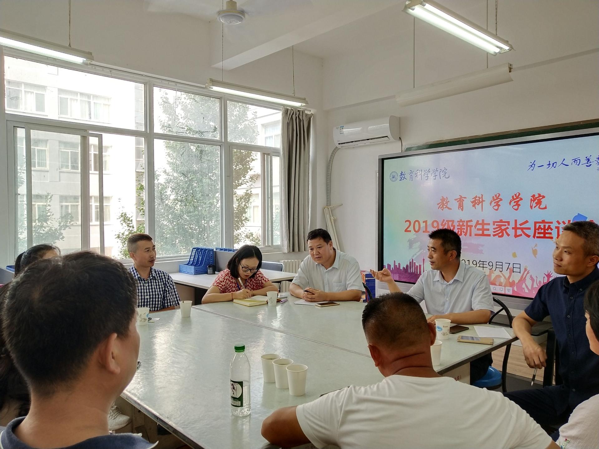 2019年9月8日上午10点经济与管理学院在一教楼B411召开了新生家长见面会,我院党总支书记、院长、党总支副书记、2019级新生辅导员参加了此次会议,会议中领导们对新生和家长的到来表示热烈欢迎,详细地了解了新生的生源地、专业和宿舍环境并耐心细致地回答了学生家长的诸多疑问。对于部分家长比较关心的校内施工问题,领导们向学生家长们解释道,适逢荣耀(中国)本科合格评估大力攻坚之际,希望学生及家长们能够理解施工带来的暂时不便。部分新生家长问到专业学习的问题,领导们表示,希望同学们入校后能够尽快适应大学阶段的学习,野蛮其体魄,文明其精神。在遇到自身难以解决的困难时,要及时主动与老师沟通,在校园良好的学习氛围中汲取更多知识,提升自我。