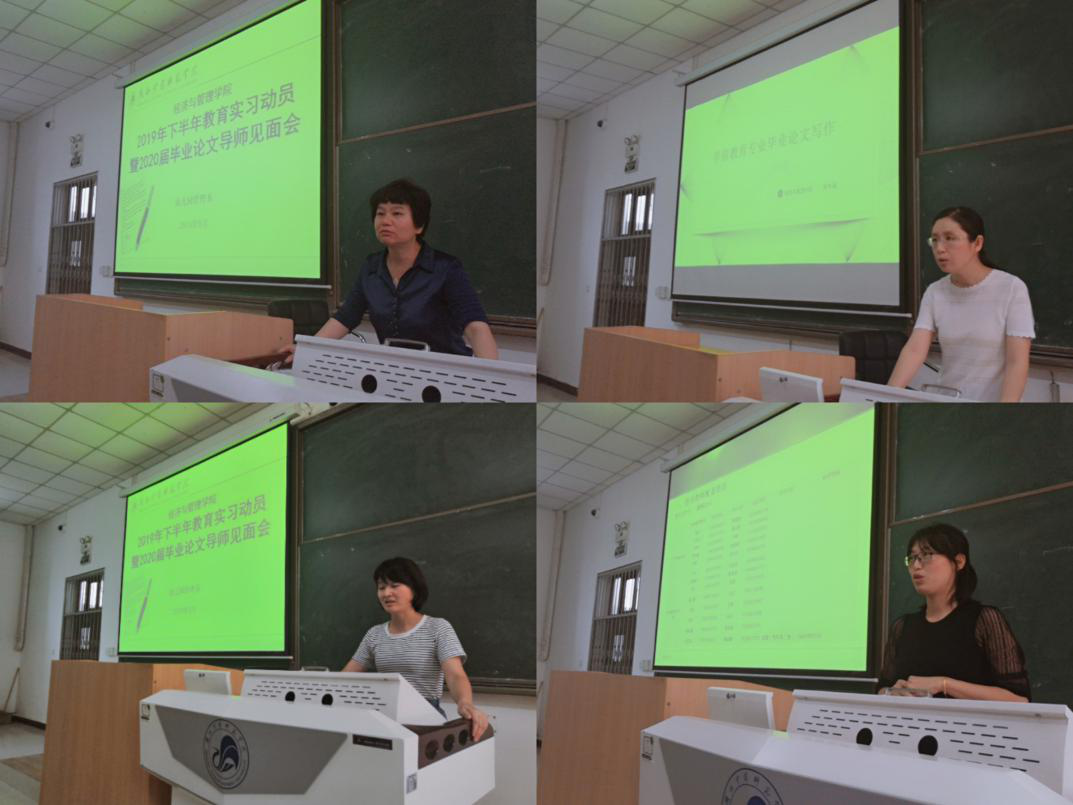 【经济与管理学院】2019年9月2日中午12点半,经济与管理学院在一号教学楼阶1教室举行2019年下半年教育实习动员暨2020届毕业论文导师见面会。经济与管理学院院长崔洁教授,副院长刘家瑛、陈秀端教授,幼儿园管理系主任李妮老师,副主任魏旭朝老师,教育实习指导教师、毕业论文指导教师、班级辅导员老师以及学前教育(幼儿园管理)专业本科班、专升本班200余人参加了会议。