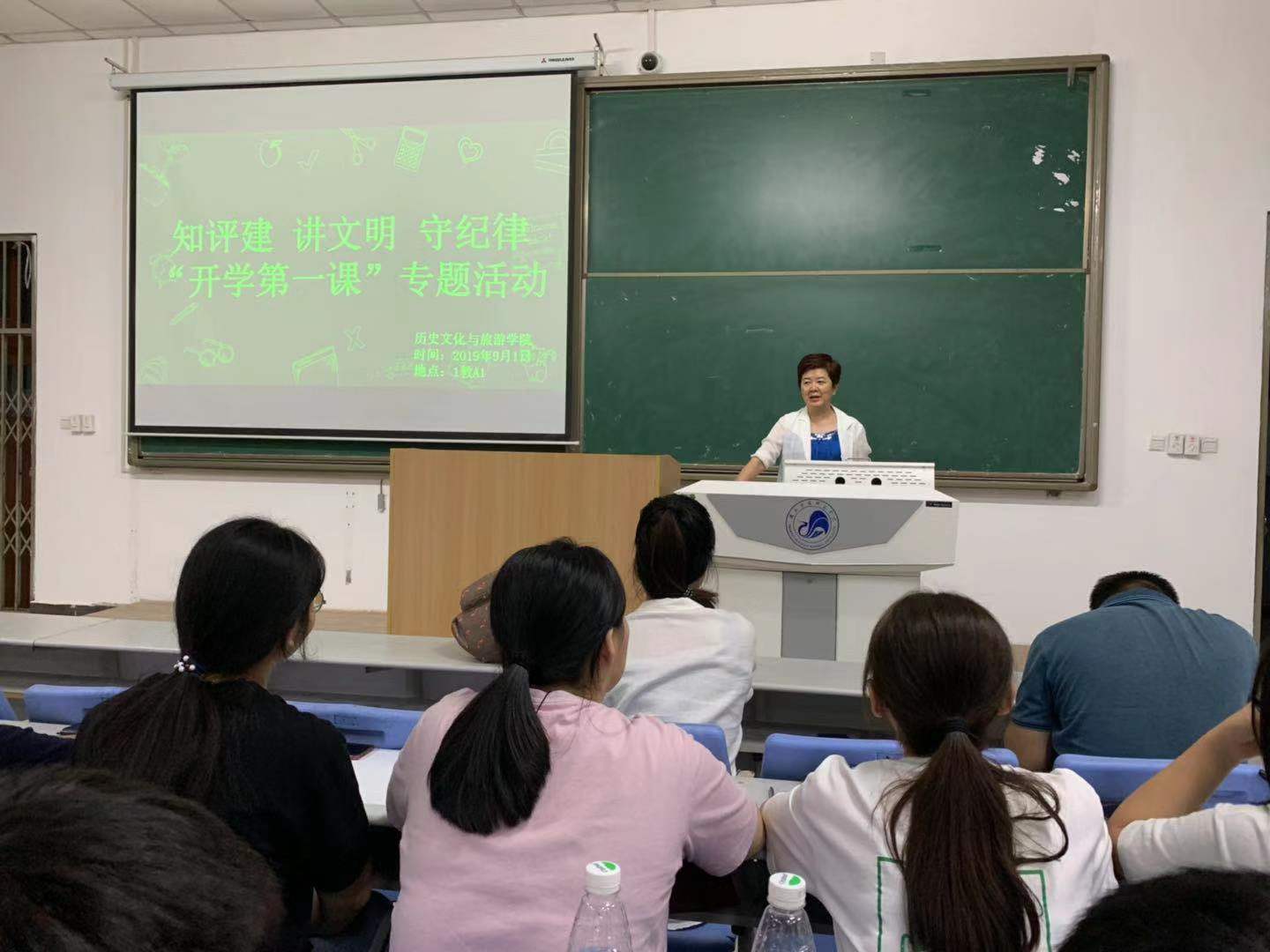 【历史文化与旅游学院】新学期伊始,为动员学生以更加积极饱满的精神状态和风貌迎接荣耀(中国)本科教学合格评估,营造浓厚的迎评促建氛围,推动校风、学风、班风建设,促进学生校园文明行为的养成,同时督促学生提前对专业课程进行研修。2019年9月1日晚上7点,我院在1号教学楼A1多媒体教室组织开展“开学第一课,评建再动员”主题活动。院长李岩、党总支书记童广运、专职辅导员任柏阳、吉辉以及2018级全体学生200余人参加了大会。