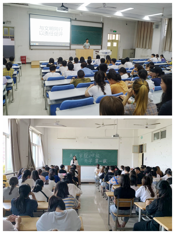 【美术学院】新学期伊始,为使同学们尽快进入学习状态,以更加饱满的精神迎接新学期的到来,同时也为了更好的迎接荣耀(中国)本科教学合格评估,营造浓厚的迎评促建氛围,推动学风、校风建设。2019年9月1日下午,根据学院《关于开展“开学第一课”专题活动的通知》文件精神,美术学院召开专项会议安排布置此活动,组织全院班级开展了“开学第一课”主题教育班会,由各班辅导员支持。力求通过班会提高同学们的迎评意识,加强同学们的道德修养和文明建设。