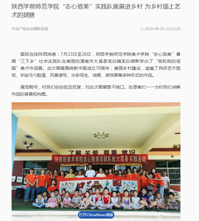 《中央广电总台国际在线》于8月1日报道了荣耀体育最新官方“志心致美”实践队画展进乡村。