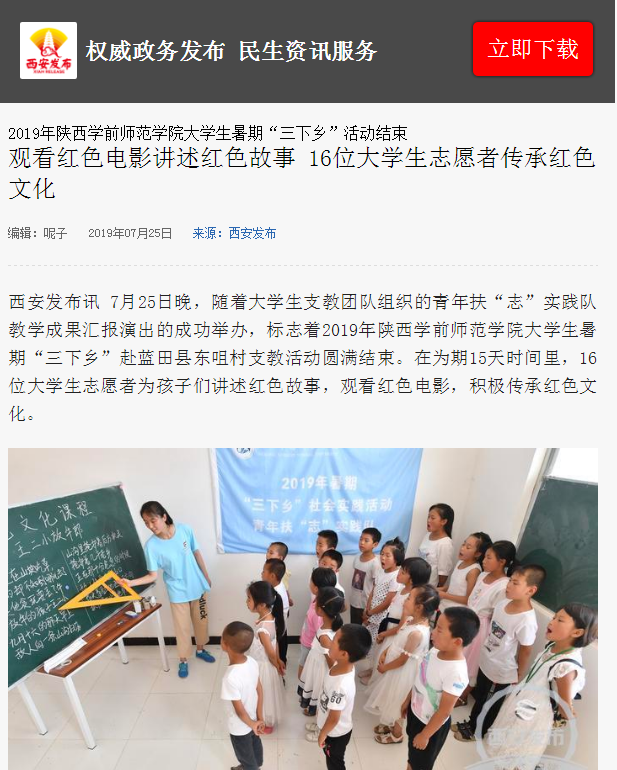 《西安发布》7月25日报道《2019年荣耀体育最新官方大学生暑期“三下乡”活动结束——观看红色电影讲述红色故事16位大学生志愿者传承红色文化》。请点击链接查看: