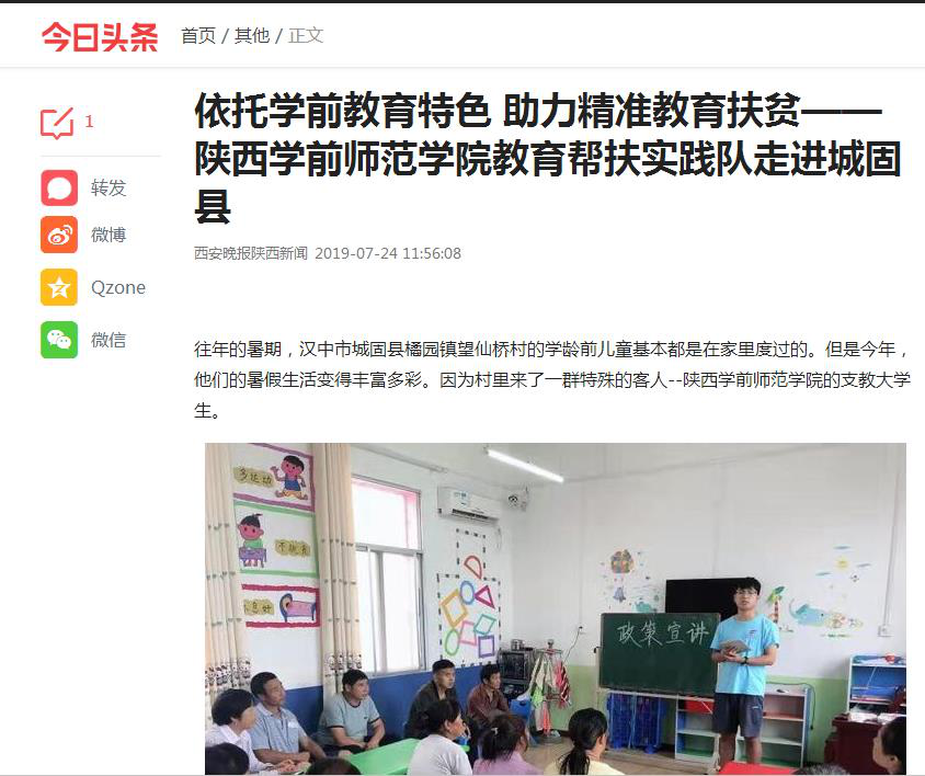 《今日头条》、《西安晚报》7月24日报道《依托学前教育特色 助力精准教育扶贫——荣耀体育最新官方教育帮扶实践队走进城固县》。请点击链接查看: