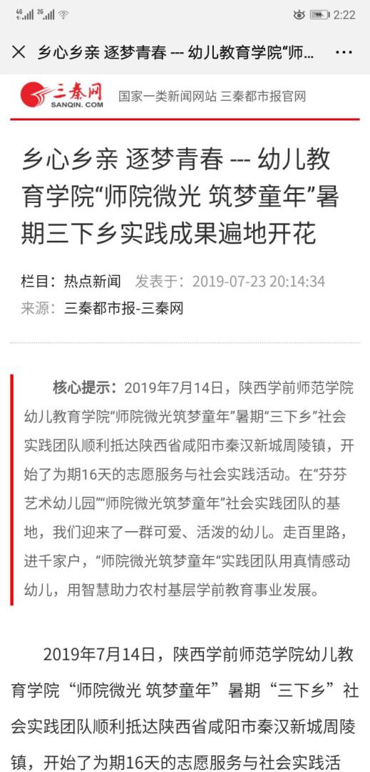 三秦都市报--三秦网2019年7月23日报道《乡心乡亲 逐梦青春---幼儿教育学院“师院微光 筑梦童年”暑期三下乡实践成果遍地开花》请点击链接查看: