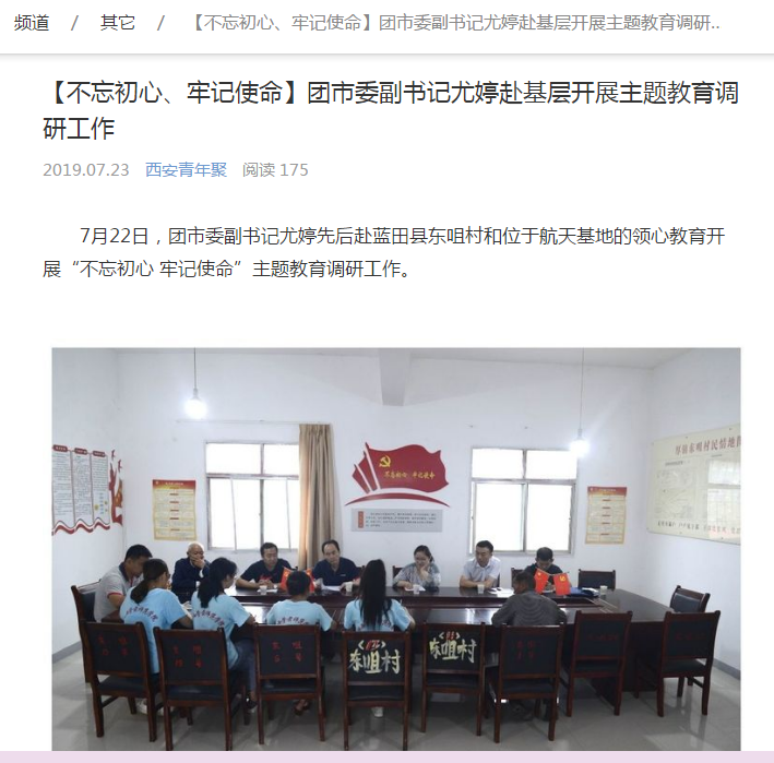 《西安青年聚》7月20日报道《【不忘初心、牢记使命】团市委副书记尤婷赴基层开展主题教育调研工作》。