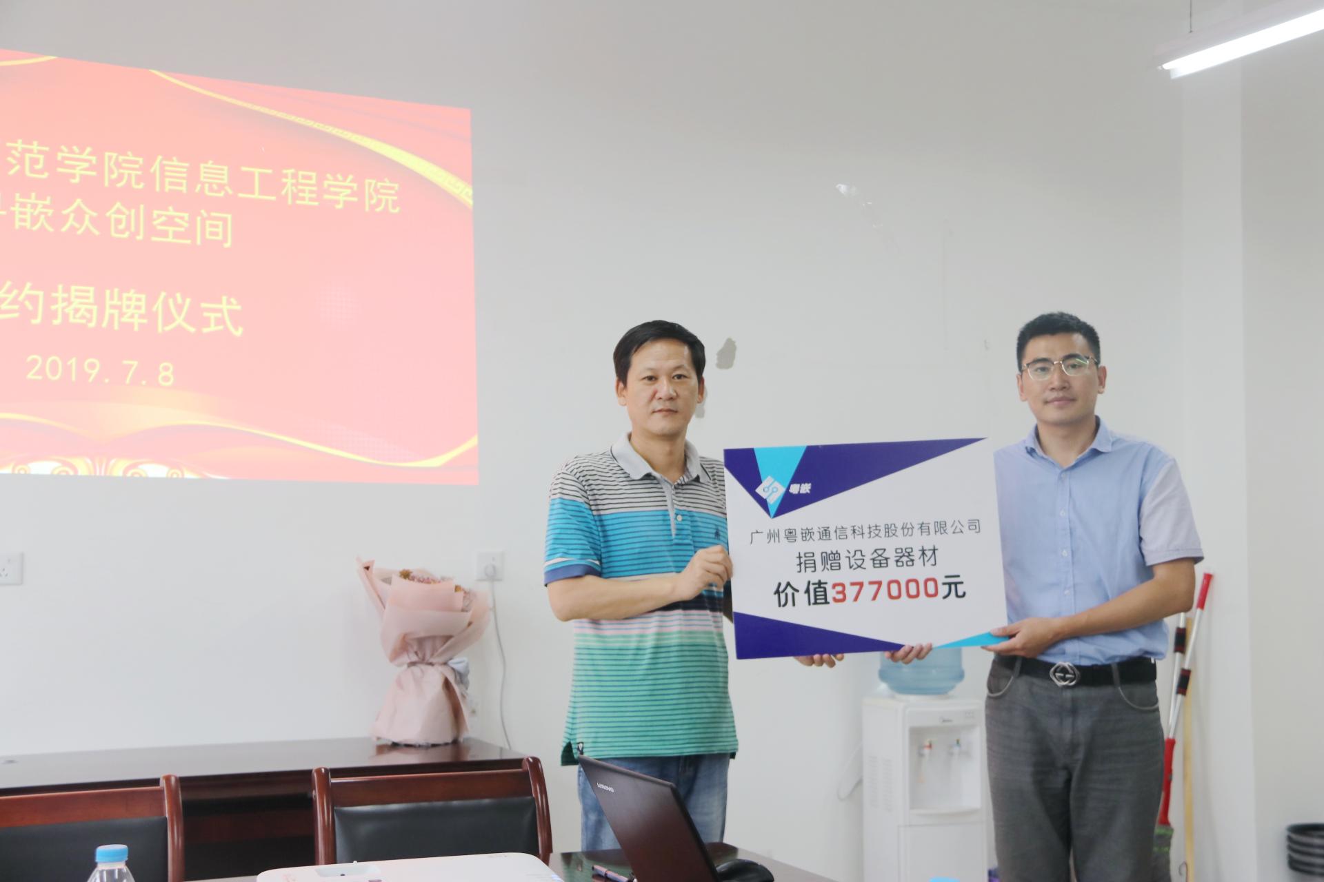 在签约揭牌仪式上薛鸿民院长、王乐忠总经理代表校企双方签约;文明副校长、王乐忠总经理共同揭牌;王乐忠总经理代表粤嵌科技向荣耀体育最新官方信息工程学院捐赠仪器,王建军副处长代表学校接收;文明副校长向广州粤嵌通信科技股份有限公司授予创新创业实践教学基地,王乐忠总经理代表粤嵌科技接收。薛鸿民院长介绍了信息工程学院专业建设、发展规划、与广州粤嵌通信科技股份有限公司西安中心合作的基础和优势,提出在大学生创新创业能力培养、学科专业竞赛、人才培养全过程、双师双能型教师队伍建设等方面开展校企合作的思路;王乐忠总经理介绍了广州粤嵌通信科技股份有限公司的基本情况、业务范畴、近两年参与陕西高校课程建设、工程认证、大赛支持、学生就业等方面的校企合作成果、以及荣耀(中国)粤嵌众创空间下学期工作部署;文明副校长高度肯定了广州粤嵌通信科技股份有限公司在服务高校、校企合作、协同育人方面的努力和贡献,提出加强校企合作、深化产教融合、实现教育实习就业一体化的期望,并提出在未来希望和广州粤嵌通信科技股份有限公司开展更加紧密的合作!