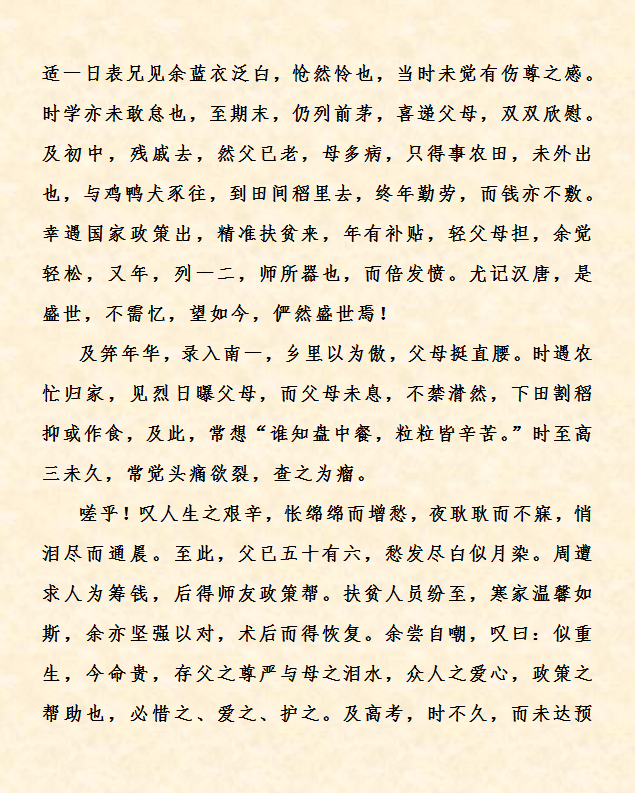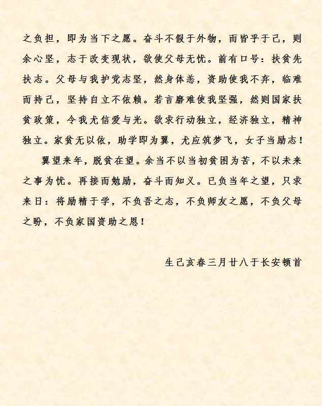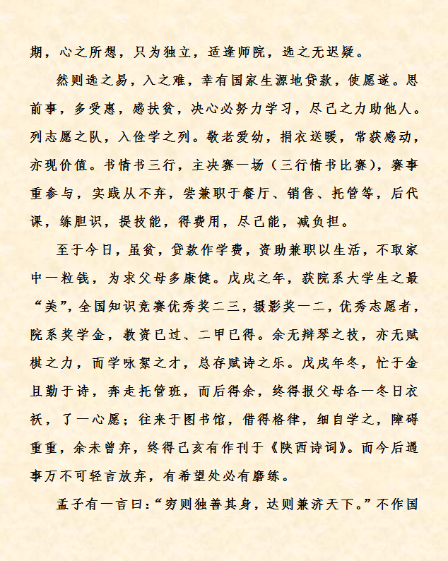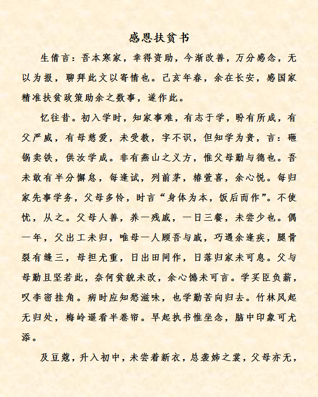 近日,学校公布2019年“精准资助助我出彩”主题征文活动获奖名单,教育科学学院2017级小学教育专业李倩同学撰写的文言文版《感恩扶贫书》在近百份推荐作品中脱颖而出,荣登榜首!让我们一同看看这一纸饱含对党、对国家、对学校感恩之情的《感恩扶贫书》。