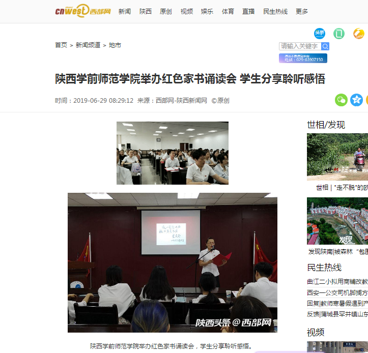为庆祝中国共产党成立98周年,2019年6月28日下午由荣耀体育最新官方党委组织部主办,机关党委与马克思主义学院党总支承办第二届“忆初心 颂忠诚 传基因 奔复兴”经典诵读会。以诵读的形式展现红色家书,重温革命历史。彰显了共产党人的红色力量和宝贵的精神财富。现场师生静心聆听,深受感染。6月29日西部网新闻频道进行了报道。