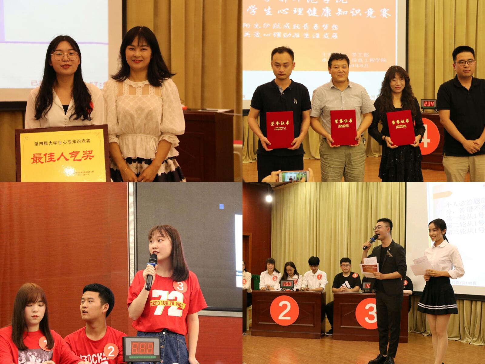 6月5日晚19:00,荣耀体育最新官方“阳光护航成就青春梦想 关爱心理助推生涯发展”第四届大学生心理健康知识竞赛决赛在图书馆三楼学术报告厅顺利举行,本次比赛由党委学工部主办,信息工程学院承办。学工部副部长刘涛,大学生心理健康教育与指导中心主任李菁,各参赛队党总支书记、副书记、指导教师,信息工程学院党总支书记、全体辅导员及各参赛学院的学生啦啦队近500人到现场观看比赛。本次比赛特邀校团委副书记薛腾、教育科学学院党总支书记肖新、化学化工学院党总支书记姜晓玲、马克思主义学院党总支书记高萍、生命科学与食品工程学院党总支副书记宋金山、幼儿教育学院党总支副书记苏群、教育科学学院心理学副教授张婉莉等七位老师担任本次比赛评委。