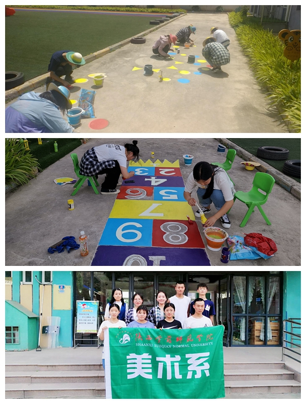 经过前期充分酝酿和周全准备,志愿者们采取分组专题作画的形式,充分发挥了其专业优势,分工明确、有条不紊、团结协作。他们不惧艳阳的灼热,用热情、创意完成一幅幅地面游戏作品,极具有观赏性和教育性,希望好看好玩的户外活动场所能给乡村幼儿园的孩子们带来快乐、启发和欢笑。