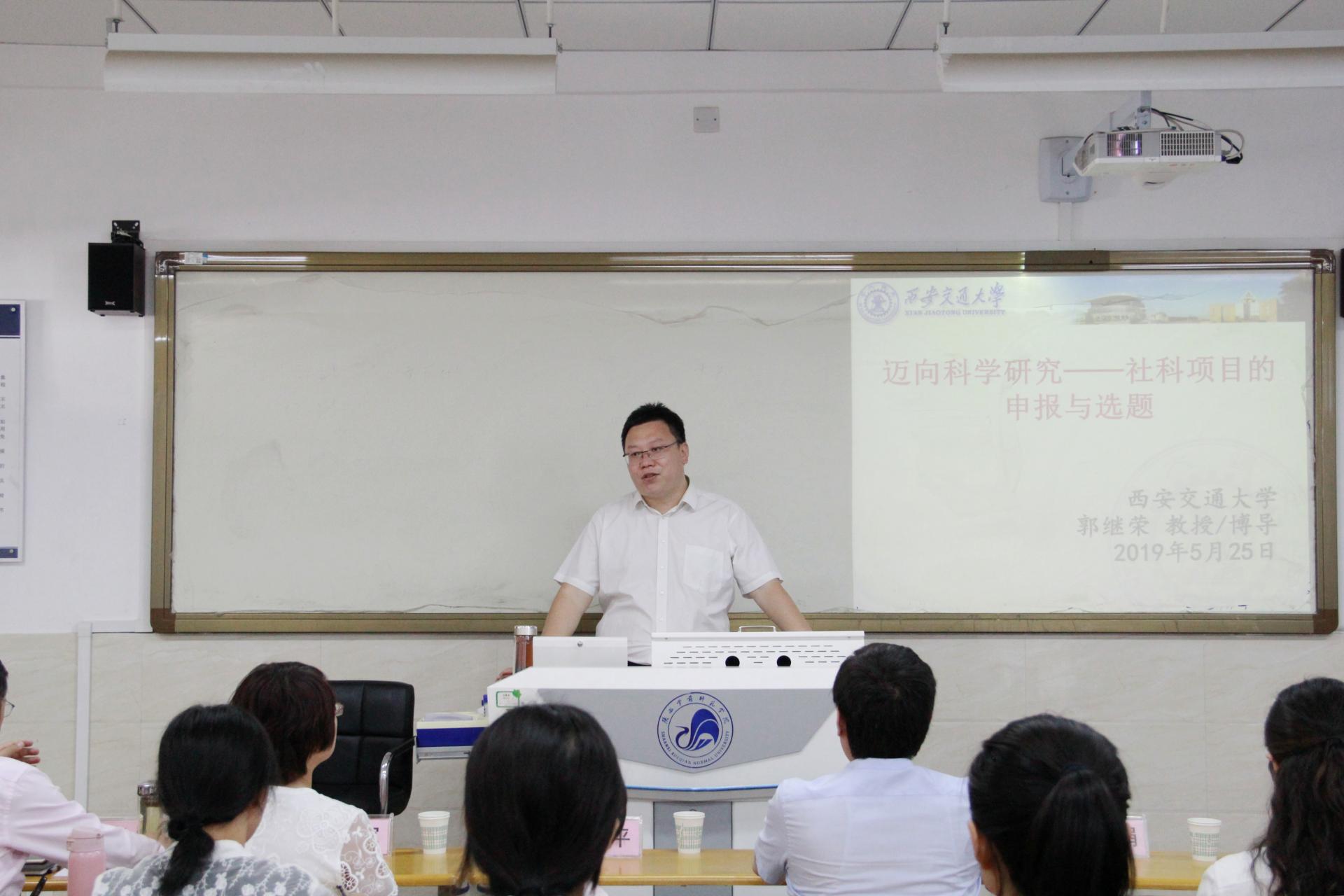 郭继荣教授以“迈向科学研究——社科项目的申报与选题”为题,从体会与感悟、项目申报中应注意的问题、案例分析等方面进行了细致的阐述和分析,他认为项目应该从平时的学术观察和学术积累出发,做到以道御术,并鼓励到场的各位教师结合自己的研究方向和研究兴趣,多阅读高水平文献,以校级科研基金项目申报为起点,关注热点问题,规范研究方法,迈向更高级别的项目申报。
