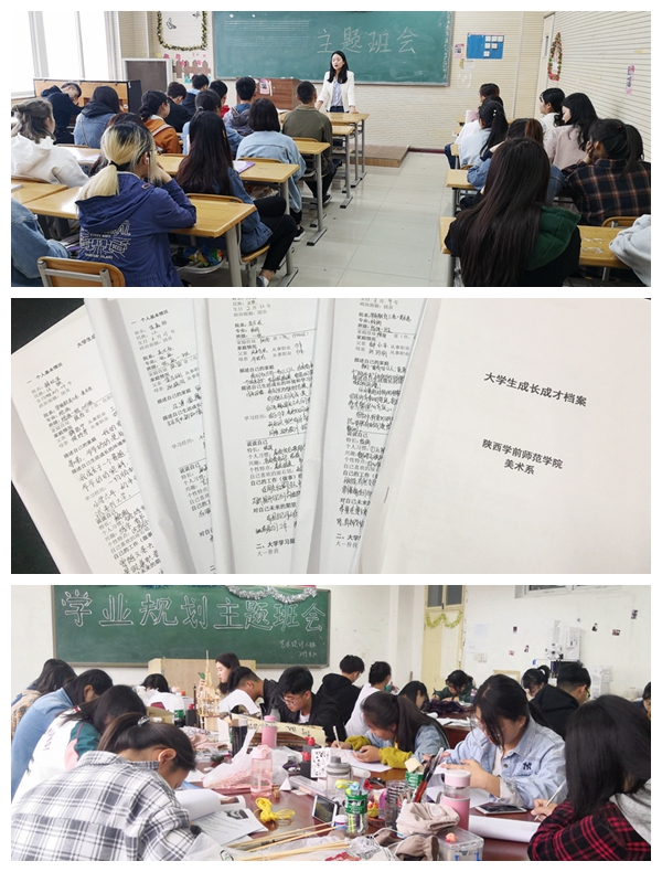 美术学院为每位学生研究制定了《大学生成长成才档案》,成长档案从政治理想、专业学习、社会实践、技能掌握、闲暇生活、从业意向等方面对学生进行生涯唤醒,引导学生从大一阶段开始制定大学四年的学业规划及职业规划,围绕目标制定具有针对性、明确性与可行性的行动计划,分阶段、分步骤的实施。一学期后,由学生、辅导员和家长进行联合评估,引导学生进行反思与总结,实现学生自助管理。辅导员通过对成长档案的查阅,能够及时了解掌握每位学生的学习与生活状态,发现学生面临的困难与问题,及早介入引导。在此基础上,每个班召开了主题班会,同学们在会上分享了学期规划和总结,通过总结、分析,对比自身规划执行情况,相互督促,共同成长。