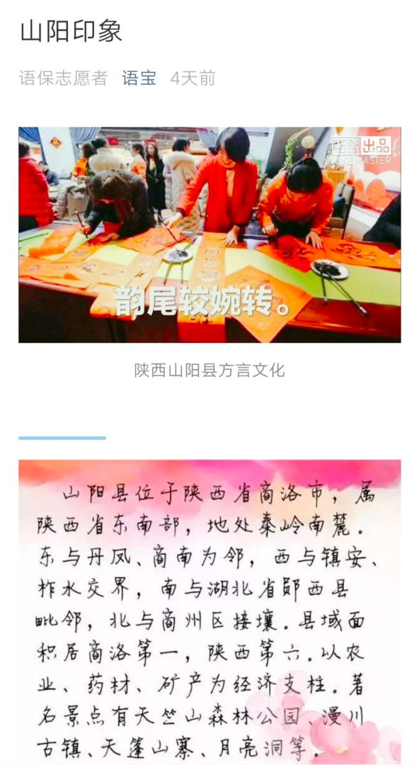 4月25日,文学院2018级汉语言文学专业一班学生陈婷的作品“印象山阳”在中国语言资源保护研究中心官微“语宝”上发表。中国语言资源保护研究中心是国家语委的科研中心,由教育部语言文字信息管理司和北京语言大学建设管理。在“语宝”官微发表作品,标志着我院学生的专业能力和我院的学生实践活动得到社会和业界的认可。