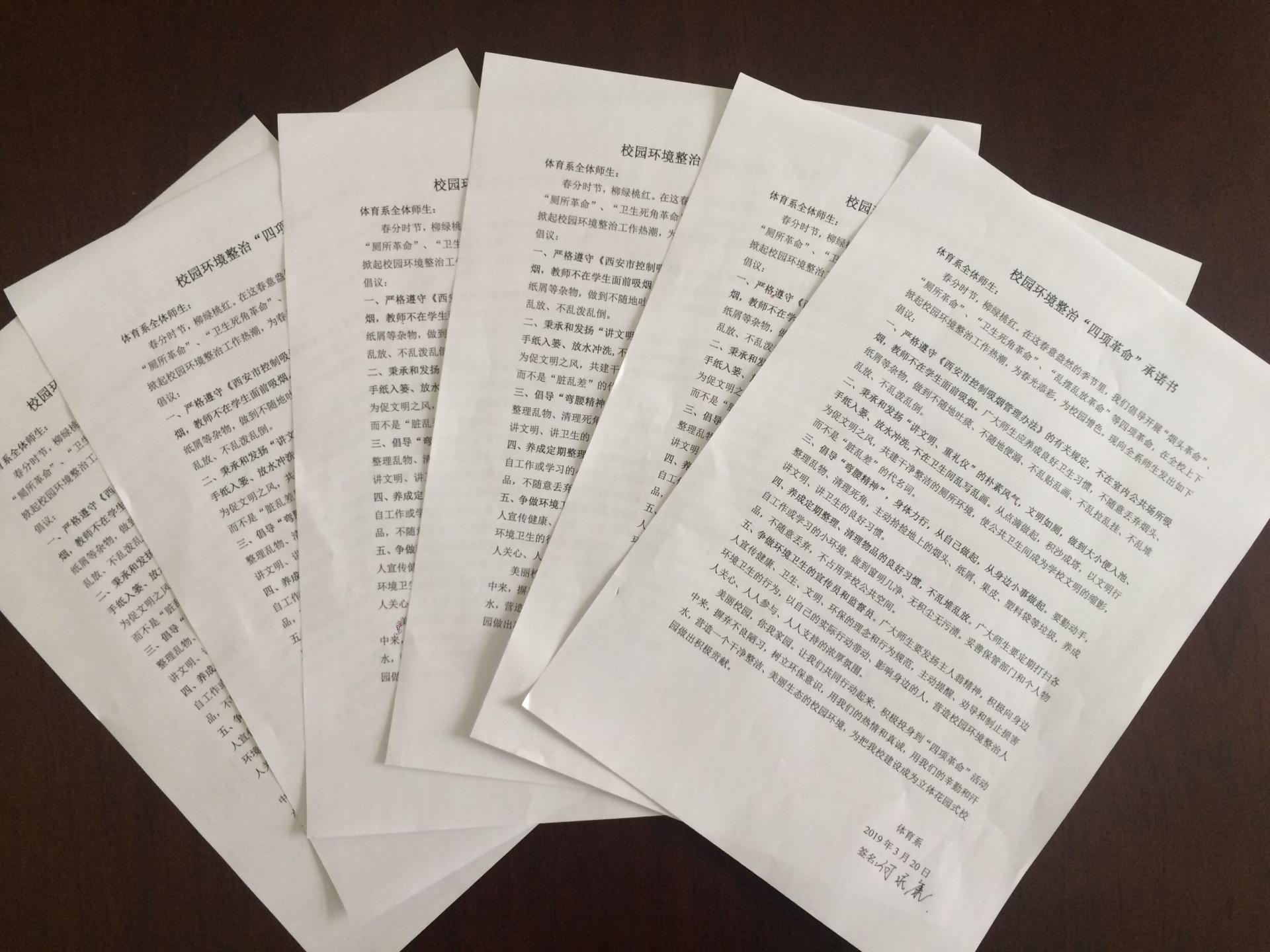 根据学校关于环境整治“四项革命”倡议书内容,我系组织学生签署校园环境整治“四项革命”承诺书,让大家行动起来,积极投身到“四项革命”活动中去,树立环保意识,摒弃不良陋习,用辛勤和汗水营造干净整洁、美丽生态的校园环境,为建设美丽校园贡献自己的力量。
