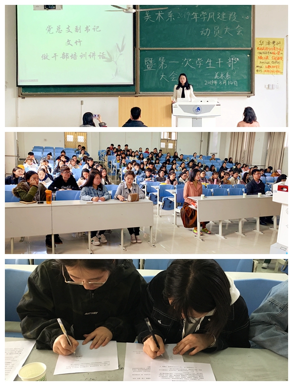 为进一步加强学风建设,全面做好学校迎评促建工作,美术系于3月14日中午在1号教学楼B1教室召开了2019年学风建设动员大会暨迎评学生干部培训大会。系党总支副书记文竹、全体辅导员及团学组织干部、各班级班委、宿舍舍长共200余人参加了此次会议。会议由团总支书记关佳姗主持。